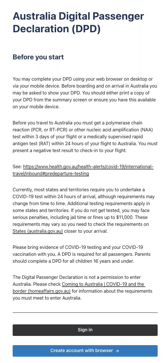 注意:DPD必須在登機前提供關鍵的健康信息。任何人如不遵守規定,可被處以最高6660澳元的民事罰款。而提供虛假或誤導性的信息是嚴重的違法行為。如果罪名成立,最高刑罰為監禁12個月。