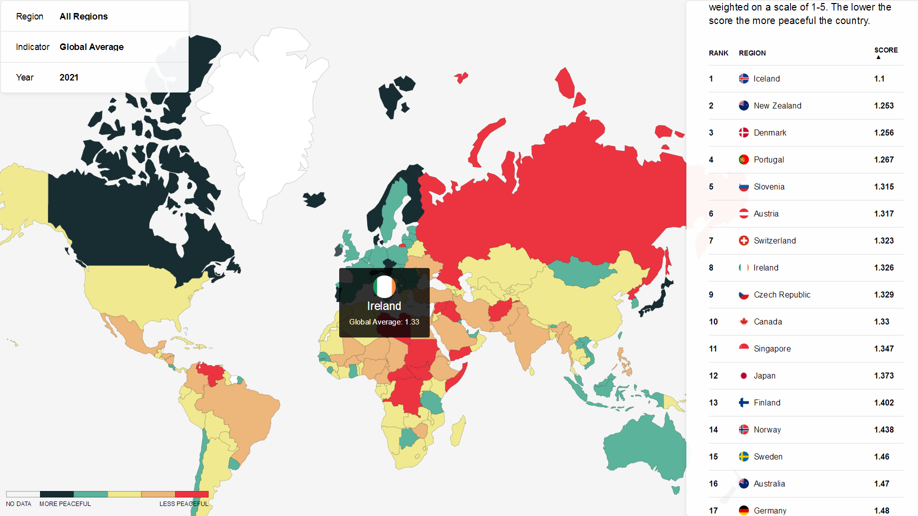 2021年,冰島再次蟬聯(lián)全球最和平國家,新西蘭、丹麥緊隨其后,分獲第2、第3名。對(duì)比2020年排名,新加坡跌出前十,愛爾蘭前進(jìn)3位取而代之。此外,日本排名第12,澳大利亞排名16,英國排名33,而美國排在第122名。