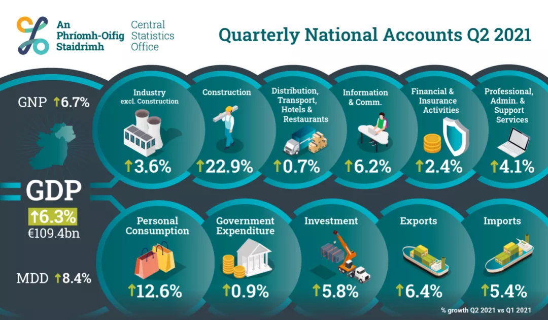 日前,愛爾蘭中央統(tǒng)計局(CSO)發(fā)布最新數(shù)據(jù):與第一季度相比,愛爾蘭2021年第二季度的經(jīng)濟增長了6.3%,該數(shù)據(jù)是歐洲所有國家中增長最高的。