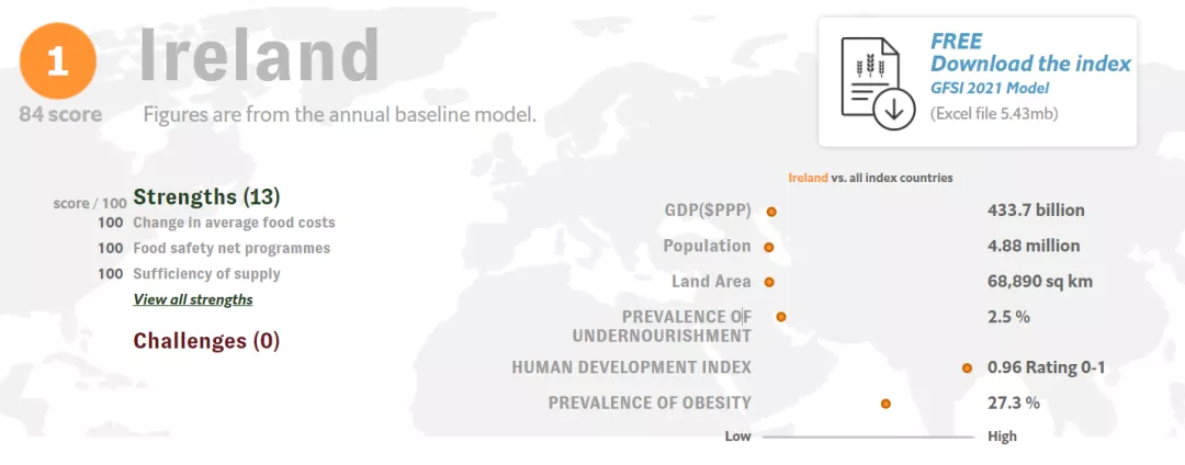 全球食品安全指數(shù)(Global Food Security Index,簡稱GFSI)排名已經(jīng)發(fā)行了10年,在歷次排名中,愛爾蘭一直高居榜單前列。2014、2017年排名第一,2019、2020年位居第二。