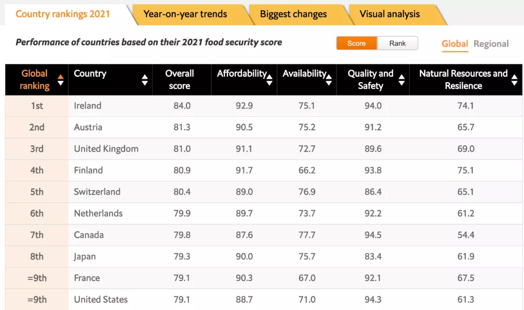 近日,全球知名雜志《經(jīng)濟學人》(The Economist Group)發(fā)布了《2021全球食品安全指數(shù)》排名,愛爾蘭以84.0的綜合分數(shù)再次摘下全球第一的桂冠!中國以71.3的綜合分數(shù)排名全球第34位。
