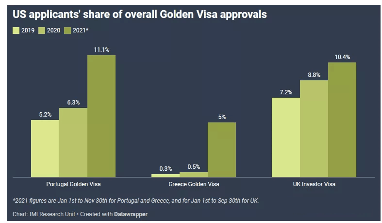 今年截至11月底,美國申請人占葡萄牙黃金簽證申請總人數的11.1%,占比相較2020年幾乎翻了一番;占希臘黃金簽證申請總人數的5%,占比相較2020年更是翻了10倍。今年截至9月底,美國申請人占英國投資者簽證總量的10.4%,同樣處于穩步上升趨勢。