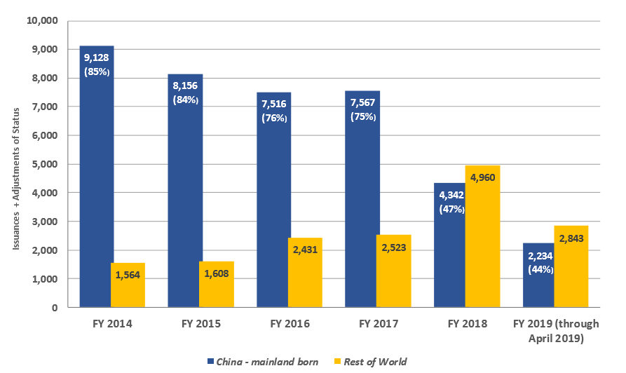 自2015財年中國大陸EB-5申請人開始出現(xiàn)排期后,2015財年中國大陸出生的申請人占用了8,156個簽證名額(占全球84%),2016財年為7,516個(占全球76%),2017財年為7,567個(占全球75%),2018財年為4,342個(占全球47%),截止到2019年4月份中國大陸僅分配了2234個簽證名額(占全球44%)。
