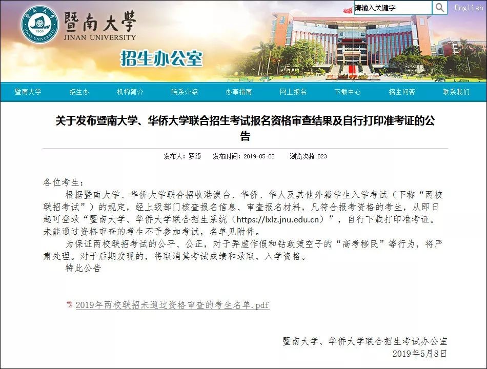 5月8日,暨南大學招生辦公室網(wǎng)站上發(fā)布公告,稱根據(jù)暨南大學、華僑大學聯(lián)合招收港澳臺、華僑、華人及其他外籍學生入學考試(下稱“兩校聯(lián)招考試”)的規(guī)定,經(jīng)上級部門核查報名信息、審查報名材料,未能通過資格審查的考生將不予參加考試。