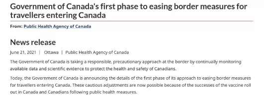 6月21日,加拿大聯(lián)邦政府宣布放寬兩項(xiàng)入境限制: