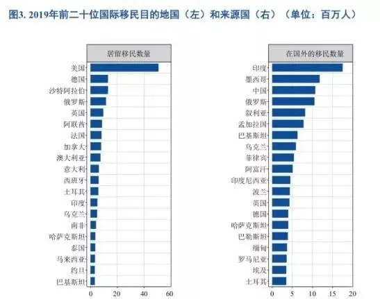 根據(jù)報告,印度仍是國際移民的最大來源國,居住于國外的印度移民人數(shù)為1750萬。其次是墨西哥和中國,分別為1180萬和1070萬。自1970年以來,美國一直是國際移民的主要目的地國,移民數(shù)量從當年的不足1200萬增至2019年的5070萬。其次是德國、沙特阿拉伯、俄羅斯和英國。