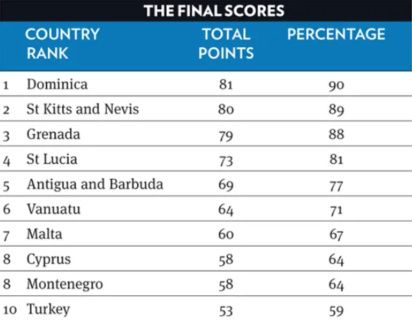 綜合比較中,加勒比海國護(hù)照繼續(xù)保持歷年以來的領(lǐng)先地位,多米尼克護(hù)照拔得頭籌,圣基茨護(hù)照和格林納達(dá)護(hù)照分列第二和第三。