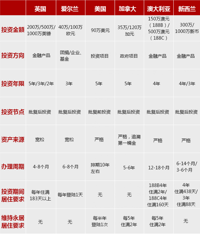 小銘劃重點:如果希望投資金額少,加拿大、美國在6國中相對更低,值得一提的是,澳洲188B投資移民今年7月起投資額將提升至250萬澳元起;如果希望投資款早日返還,愛爾蘭是最快的;資產(chǎn)來源方面,英國、愛爾蘭的審核相對寬松;而居住要求方面,愛爾蘭、美國則更自由。