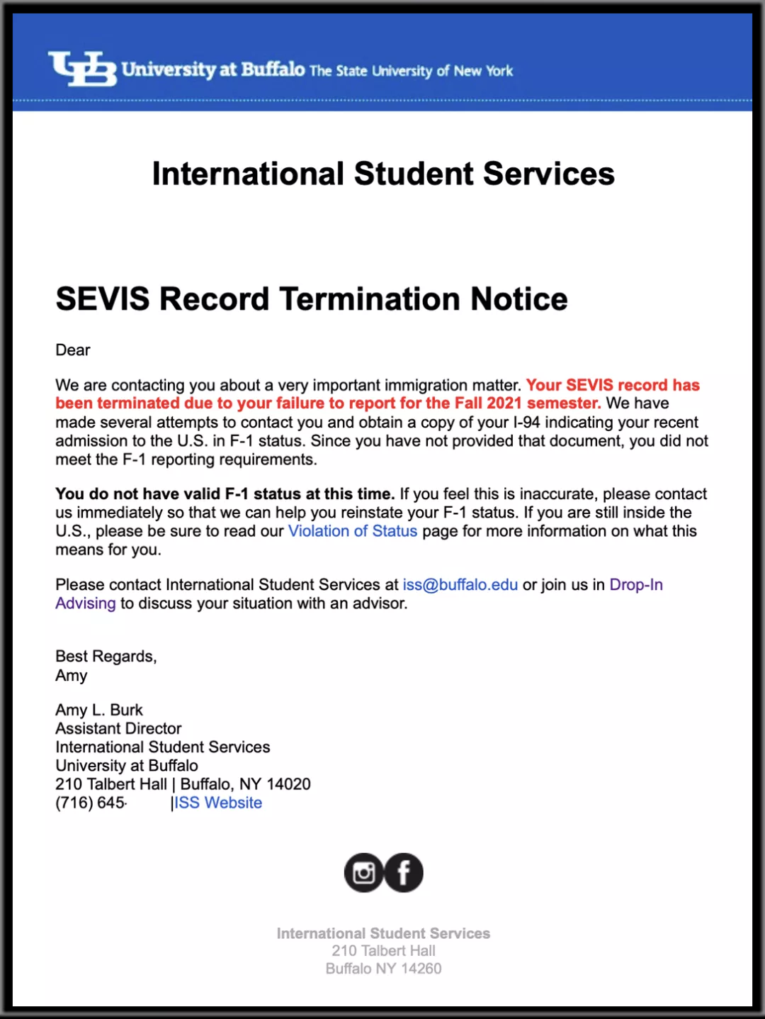 今年9月28日,紐約州立大學(xué)布法羅(SUNY Buffalo)分校的多名留學(xué)生,其中包括至少30名中國(guó)留學(xué)生,收到校方郵件通知:由于學(xué)生未能在開學(xué)一個(gè)月的時(shí)間內(nèi),向?qū)W校的國(guó)際學(xué)生事務(wù)辦公室報(bào)到,并遞交I-94副本,校方不再認(rèn)可其留學(xué)生身份,根據(jù)美國(guó)相關(guān)的移民法律,這些學(xué)生的F-1簽證將被終止,并須盡快離境!