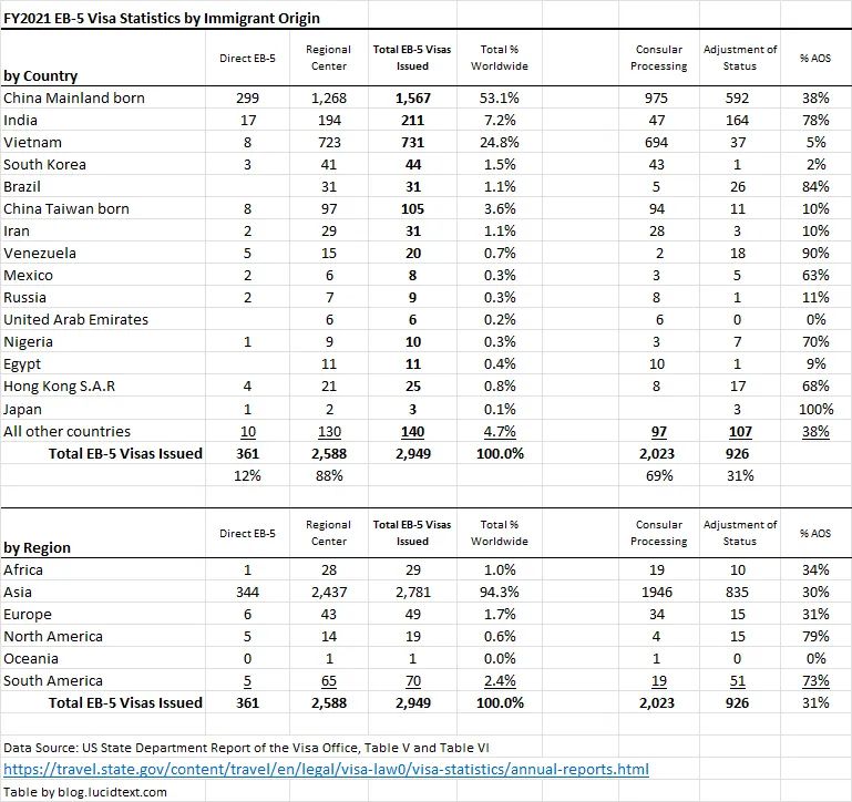 ①2021財年,全年共發放2949張EB-5簽證,其中926張來自于移民局,2023張來自于各國使領館;