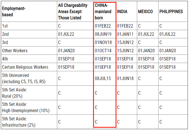 EB-5非預留類別:排期為2015年7月8日,無變化