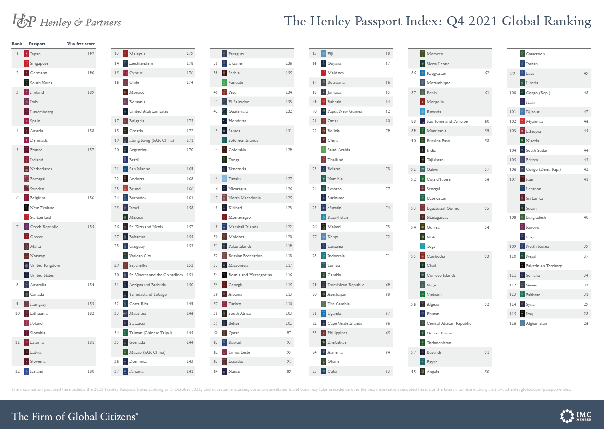 近日,亨氏護照指數(shù)(Henley Passport Index)發(fā)布了2021第四季度的全球護照排名。