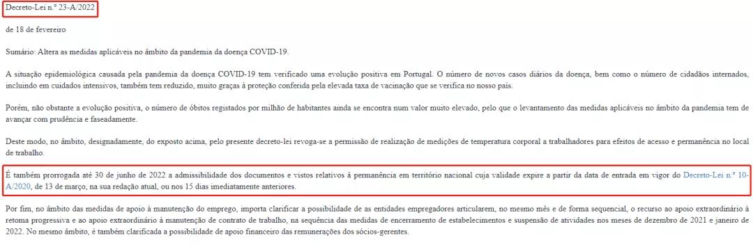 據(jù)葡萄牙部長(zhǎng)理事會(huì)決議,于2022年2月18日登報(bào)生效的Decreto-Lei n.º 23-A/2022 法律,其中明確了在2020年2月24日之后過期的居留卡,其有效期可自動(dòng)延期至2022年6月30日。自上次延期至2022年3月31日后,此次延期時(shí)長(zhǎng)再增3個(gè)月。