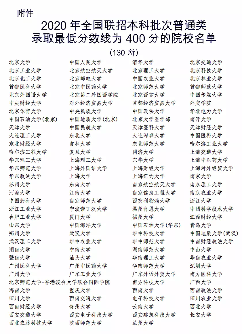 (一)普通類(lèi)院校(專(zhuān)業(yè))文史、理工類(lèi):300分(其中,部分院校執(zhí)行400分,院校名單見(jiàn)附件);